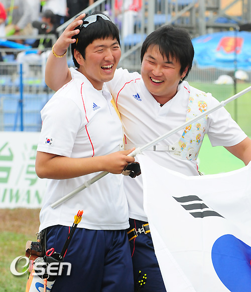 금메달이 확정된 순간 오진혁과 김우진이 기쁨을 나누고 있다. / ajyoung@osen.co.kr