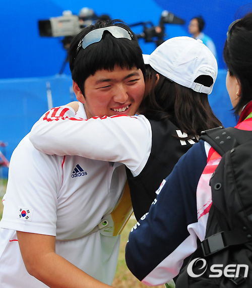 시상식을 마친 김우진이 양궁 관계자로부터 축하를 받고 있다. / ajyoung@osen.co.kr