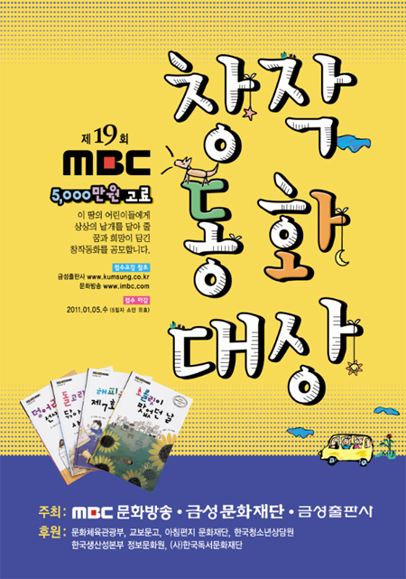 (재)금성문화재단과 (주)금성출판사, MBC문화방송이 공동으로 주최하고 문화체육관광부와 교보문고가 후원하는 ‘제19회 MBC창작동화대상’의 참가작을 2011년 1월 5일까지 공모한다.