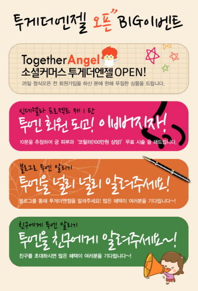 김 대표는 “이번 론칭 이벤트는 총 4개로 나뉘어 진행되며 ‘소셜커머스 투게더엔젤 가입하고 상품받기’, ‘투엔이 지원하는 투엔 회원되고 예뻐지자’, ‘투엔을 널리알려주세요’, ‘투엔을 친구에게 알려주기’ 등으로 구성돼 있다”고 덧붙였다.