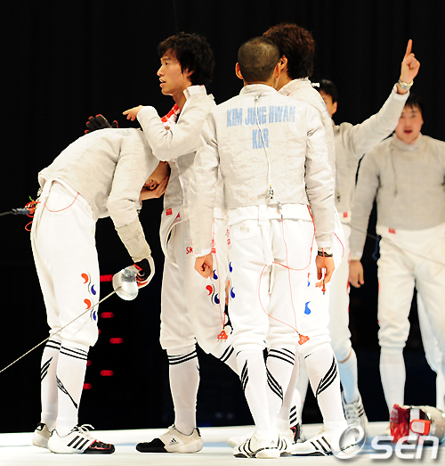 오은석(27, 국민체육진흥공단) 김정환(27, 국군체육부대) 구본길(21, 동의대) 원우영(28, 서울메트로)으로 이루어진 한국은 22일 광저우 광다 실내체육관에서 벌어진 중국과의 광저우 아시안게임 남자 펜싱 사브르 단체 결승전서 홈 텃세 속 분전했으나 44-45로 아깝게 패하고 말았다.