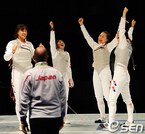한국이 일본을 꺾고 광저우 아시안게임 여자 펜싱 플뢰레 단체전 금메달을 수확했다.