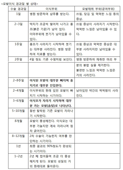 모발이식을 한 후 경과는 환자마다 조금씩 다르지만 일반적 경과는 아래 표와 같다.