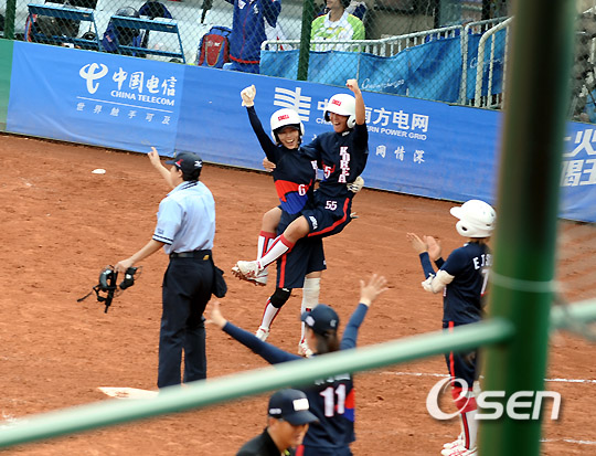 연장 9회 김보람의 끝내기 안타로 홈을 밟은 이은미(왼쪽)와 천향나가 얼싸안고 기뻐하고 있다.