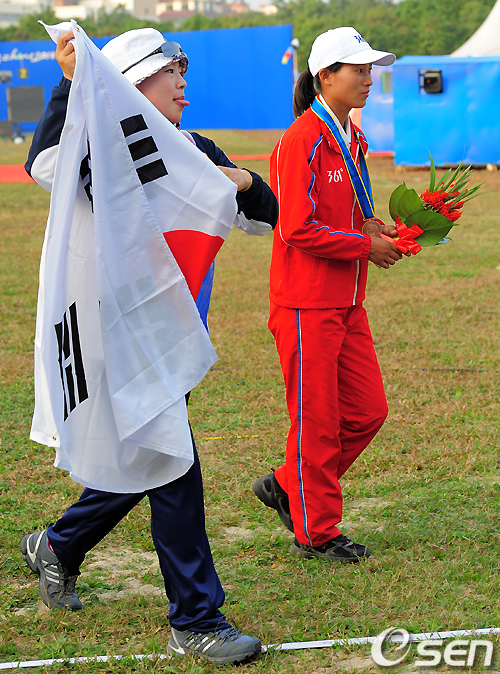 윤옥희와 동메달을 획득한 북한 권은실이 시상식을 마치고 경기장을 나서고 있다. /jpnews@osen.co.kr