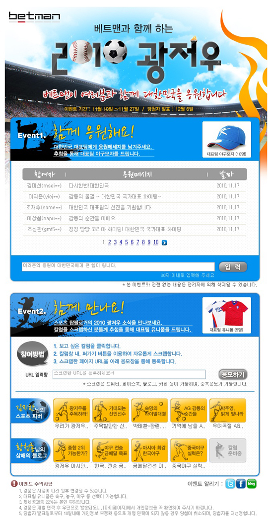 두 번째 이벤트인 '함께 만나요!'는 스포츠 탑블로거 김지한, 황청룡의 칼럼을 트위터, 페이스북, 블로그, 카페 등으로 스크랩한 후 페이지 주소(URL)를 등록하면 된다. 이벤트 참여자에게는 추첨을 통해 한국 대표팀 유니폼(5명)이 주어진다.