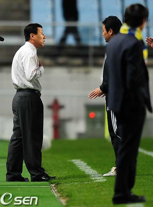 종료를 얼마 남지 않은 상황에서 전북 최강희 감독이 심판과 항의를 할때 신태용 감독이 바라보고 있다./rumi@osen.co.kr