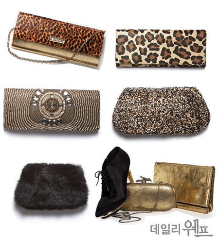 여성스러운 느낌으로 오피스 룩이나 캐주얼한 스타일과도 다양하게 코디가 가능한 비즈와 큐빅 등 보석 장식의 클러치, 연말 파티 아이템으로 가지고 갈 만한 퍼로 둘러싼 럭셔리한 지갑 형태의 클러치와 글래머러스한 골드빛 도회적인 클러치 등으로 퍼펙트한 파티룩을 완성해 보자.