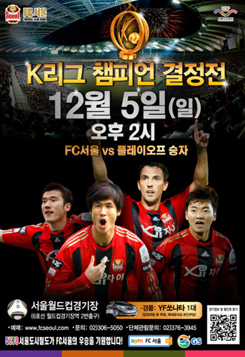 오는 12월 5일 오후 2시 서울월드컵경기장에서 열리는 챔피언결정전 최종전의 입장권은 FC서울 홈페이지(www.fcseoul.com)와 인터파크(sports.interpark.com), 가까운 GS25 편의점에서 예매가 가능하다.