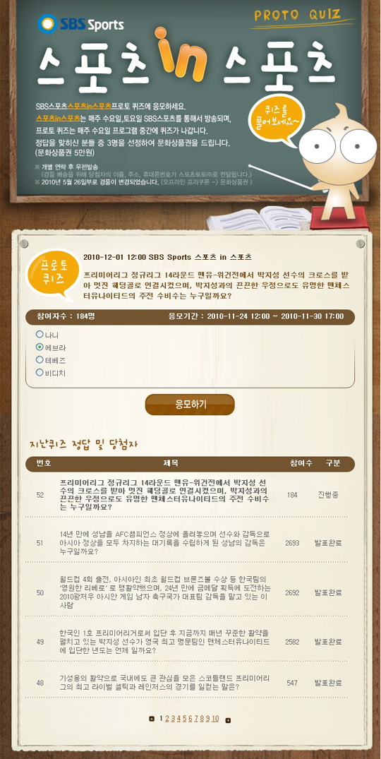 이 중 한 주 동안에 있었던 스포츠 이슈나 화제의 선수들을 대상으로 매주 1회 출제되는 시청자 퀴즈는 스포츠에 관심이 있는 사람이라면 누구나 쉽게 정답을 맞힐 수 있어 시청자들로부터 좋은 반응을 얻고 있다. 실제로 지난 23일 마감된 퀴즈에는 약 2700여명의 스포츠팬들이 참가하는 등 매 주 다양한 참가자들이 퀴즈에 응모하고 있다.