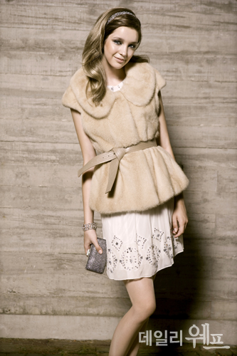 여기에 컬러감이 있는 가죽벨트로 허리라인을 잡아주면 날씬하게 잡아주고, 모피의 무거운 느낌을 쉬폰 스커트나 원피스로 매치한다. 헤어밴드로 자연스럽게 넘긴 헤어에 웨이브를 주어 귀엽고 깜찍한 스타일을 완성한다.