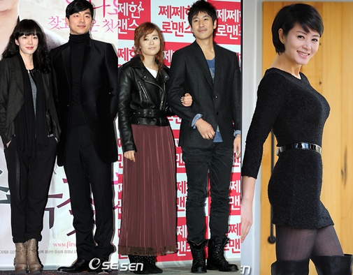 다음날 열린 영화 '째째한 로맨스'의 두 주인공 역시 채도가 낮은 의상을 선택했다. 평소 옷 잘입기로 유명한 최강희는 블랙 가죽 재킷에 와인 빛깔 롱스커트를 매치, 차분하면서도 엣지있는 스타일을 연출했다.