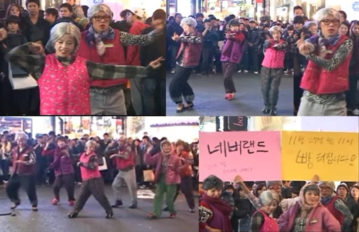 한 명으로 시작되다가 노래 중간중간에 각양각색의 몸빼 패션을 갖춘 이들이 합류, 최종 7인으로 꾸려지는 이 퍼포먼스는 지난 20일 명동서 진행됐다. 점점 인파가 몰려들어 수많은 관중이 할매시대를 에워싸는 것은 물론 모여든 사람들이 제각각 휴대폰을 꺼내 사진과 동영상을 찍는 등 진풍경이 연출되었다는 후문.