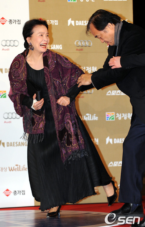 배우 윤정희가 레드카펫에 넘어질뻔하자 남편 백건우씨가 에스코트 하고 있다. /soul1014@osen.co.kr