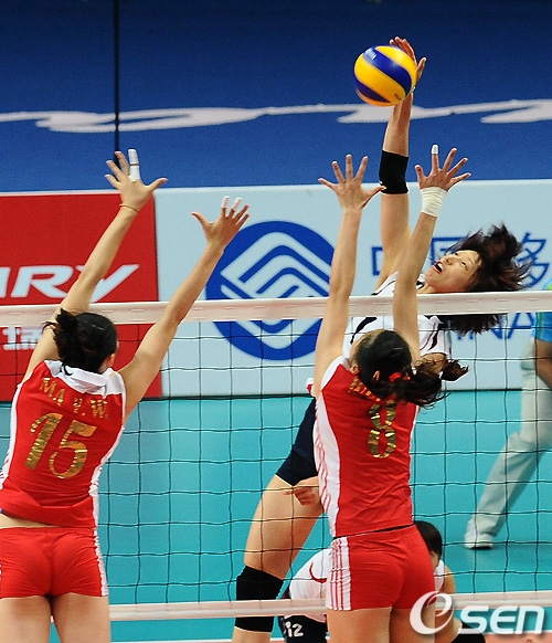 하지만 한국은 2-7로 뒤진 상황서 황연주의 서브 에이스와 김사니의 블로킹을 앞세워 연속 4득점을 올리며 경기를 대등하게 끌고 갔다. 한두점 차로 추격을 펼친 한국은 14-14 상황서 김세영이 왕이메이의 공격을 블로킹하며 처음으로 앞서갔다.