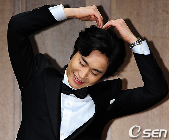 조성모가 기자회견장에서 아내에게 보내는 하트 사인을 보여주며 쑥스러워하고 있다./rumi@osen.co.kr