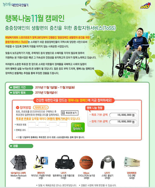 행복나눔 캠페인은 매달 스포츠토토 팬들의 기부금을 모아 어려운 이웃을 돕는 이벤트로써 이번 캠페인을 통해 적립된 기부금 1000만원은 '중증장애인 종합지원 서비스 ToSS' 사업 지원금으로 사용될 예정이다.