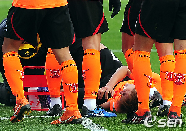 전반 볼을 다투다 부상을 당한 구자철이 괴로워 하고 있다. /spjj@osen.co.kr