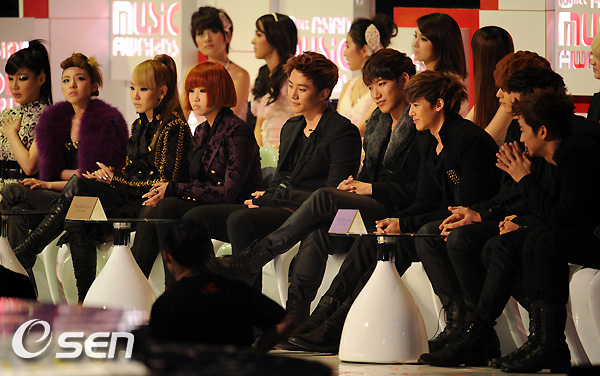 2NE1과 2PM이 떨리는 심정으로 올해의 노래상 발표를 기다리고 있다. /soul1014@osen.co.kr