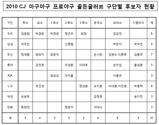 구단별로는 2루수와 3루수를 제외한 6개 부문에서 7명의 후보를 배출한 두산이 가장 많고, SK와 LG가 6명으로 그 뒤를 잇고 있다. 외국인선수와 신인선수는 올해 단 한 명도 후보에 이름을 올리지 못했다.