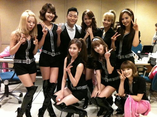 가수 싸이와 걸그룹 소녀시대가 함께 다정한 포즈를 취했다.