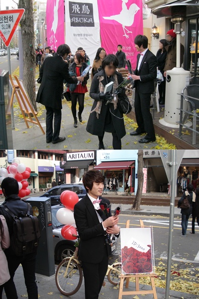 “미소가 아름다우세요”, “행복한 하루 되세요”라는 인사말을 건네며 장미꽃을 주는 네 명의 로맨티시스트가 11월 27일 토요일 오후, 신사동 가로수길에 출현하여 화제를 모았다.