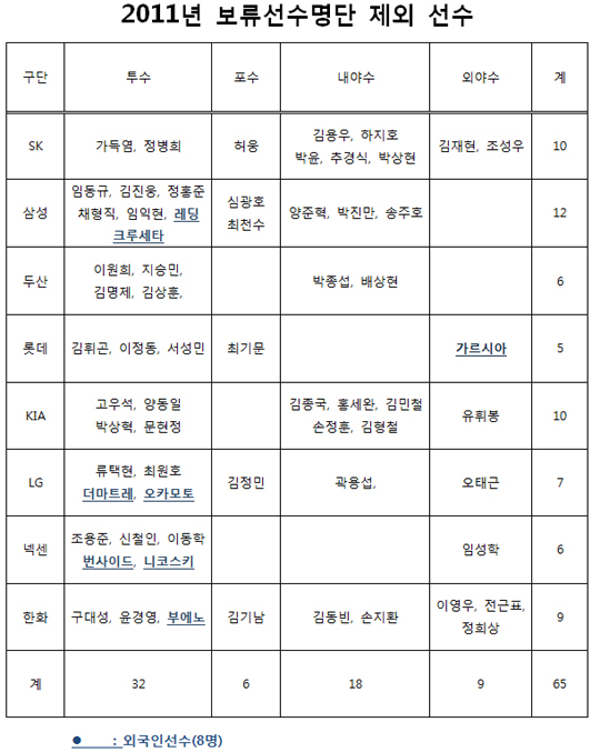 한국야구위원회(KBO)는 30일 2010년도 소속선수 중 내년도 각 구단별 재계약 대상 선수인 2011년 보류선수 449명의 명단을 각 구단에 공시했다.