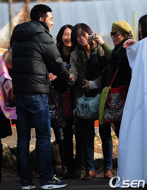 정경호가 부대 앞에서 팬들과 악수를 나누고 있다. /rumi@osen.co.kr