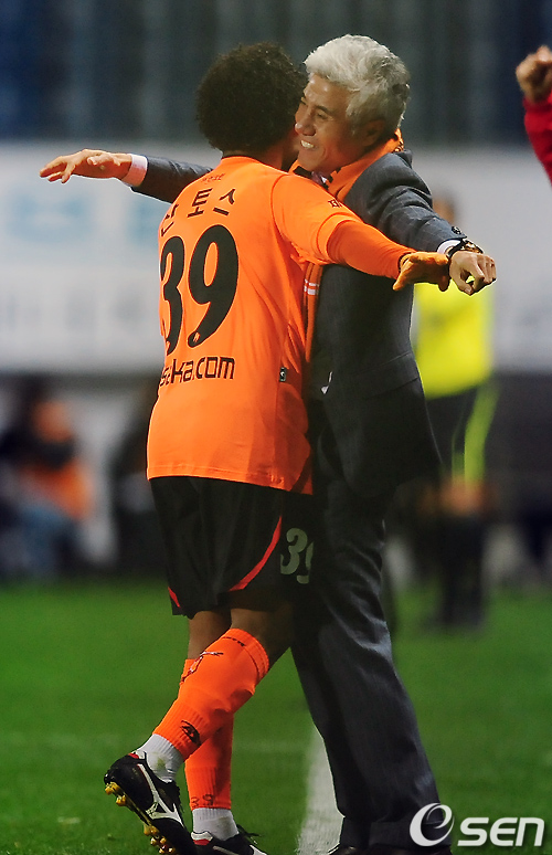 후반 6분 제주 산토스가 제주 두번째 골을 성공시킨 후 박경훈 감독과 포옹을 하고 있다./rumi@osen.co.kr