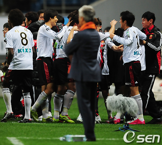 후반 인저리타임에 서울 김치우가 극적인 동점골을 성공시킨 후 동료들과 기쁨을 나누고 있을때 제주 박경훈 감독이 그 모습을 바라보고 있다./rumi@osen.co.kr