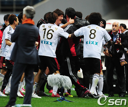 후반 인저리타임에 서울 김치우가 극적인 동점골을 성공시킨 후 서울 빙가다 감독이 선수들과 기뻐하고 있고 제주 박경훈 감독이 이 모습을 바라보고 있다./rumi@osen.co.kr