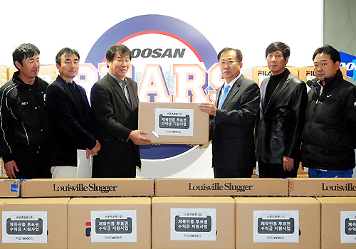두산 베어스(사장 김진)는 2일 오전 10시에 서울시 고등학교 야구팀 감독들을 사무실로 초청, 경기용 야구공과 배팅 장갑, 언더셔츠, 벤치티셔츠, 펑고 배트 등 총 2억1000여만원 상당의 야구 용품을 전달했다.