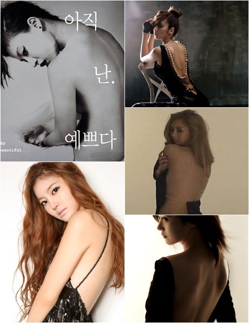 그런 이유 때문일까. 최근 여가수들의 뒤태 전쟁이 활발하다. 특히 새 앨범을 내는 가수들에게 재킷 사진에서 빠지지 않고 등장하는 것이 이 뒤태 사진이다. 군살 없이 활처럼 아름다운 곡선미로 당당함과 우아함을 드러내는 것에 한 걸음 더 나아가 액세서리나 타투로 차별된 개성을 보여주기도 한다.