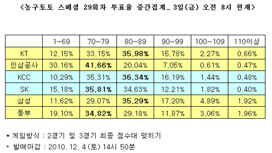국내 프로농구 주말 3경기 대상 농구토토 스페셜 29회차 투표율 중간집계 결과