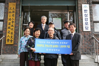 [이브닝신문/OSEN=정은진 기자] 한성대학교는 지난 2000년부터 10년간 삼선 1가 308번지 한성노인회에 매해 겨울 실내등유 1000ℓ(100만원 상당)를 제공하고 있다. 한편 한성대학교는 지난 2005년부터 학생들로 이루어진 도시락배달봉사단이 독거노인들에게 도시락을 배달하고 있다. 사진제공=한성대학교