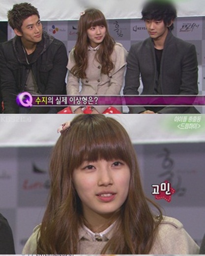 4일 방송된 KBS 2TV '연예가중계'에서는 KBS 2TV 새 월화드라마 '드림하이' 고사 현장을 공개, 수지는 인터뷰에서 실제 이상형에 대한 질문을 받았다.