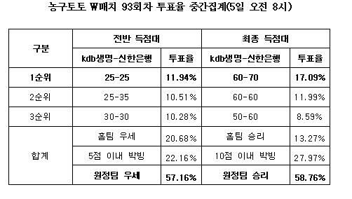 홈팀 kdb생명의 승리에 투표한 참가자는 13.27%에 불과했고, 나머지 27.97%는 양팀의 10점차 이내 박빙승부를 선택했다.