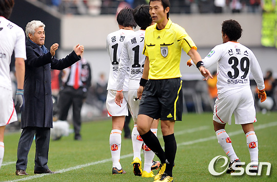 전반 제주 산토스가 선취골을 넣자 박경훈 감독이 격려하고 있다. /soul1014@osen.co.kr