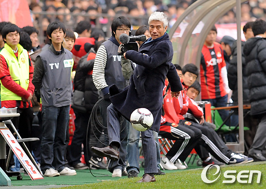전반 제주 박경훈 감독이 라인 아웃되는 공을 걷어차고 있다. /soul1014@osen.co.kr