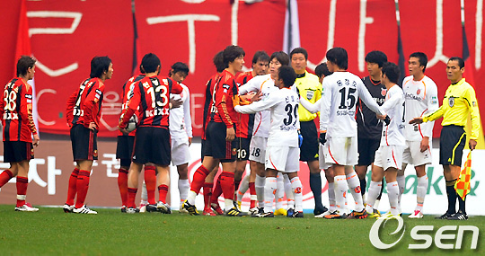 전반 양팀 선수들이 험학한 분위기를 연출하고 있다. /soul1014@osen.co.kr
