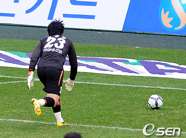후반 역전골의 빌미가 된 김호준의 실책 김호준이 백 패스를 코너킥으로 만들고 있다. /spjj@osen.co.kr