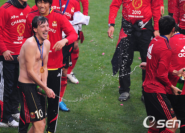 데얀이 동료 선수들에게 샴페인을 퍼붓고 있다. /spjj@osen.co.kr