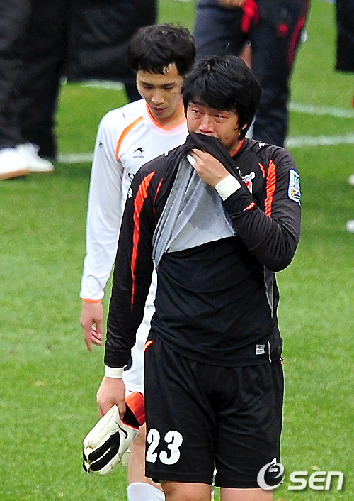 통한의 실책을 저지른 제주 골키퍼 김호준이 눈물을 글썽이고 있다. /spjj@osen.co.kr