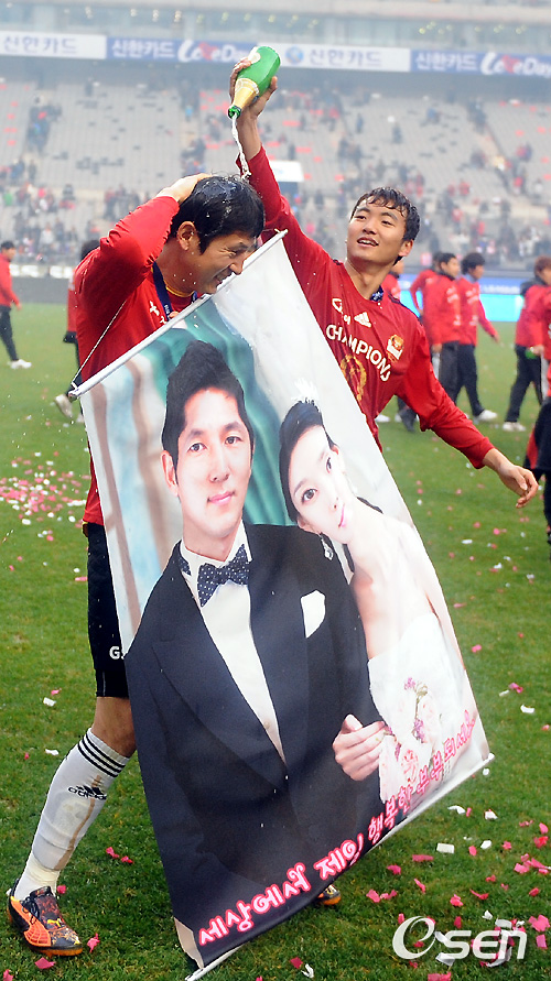 경기 종료 후 서울 이승렬이 김용대에게 샴페인을 붓고 있다./soul1014@osen.co.kr