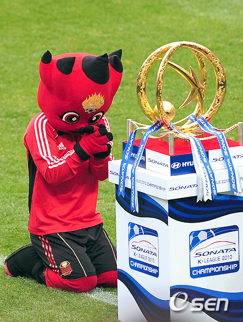 <사진>지난 5일 챔프 2차전에 앞서 우승 트로피 앞에 무릎 꿇고 기원하는 FC 서울 마스코트.