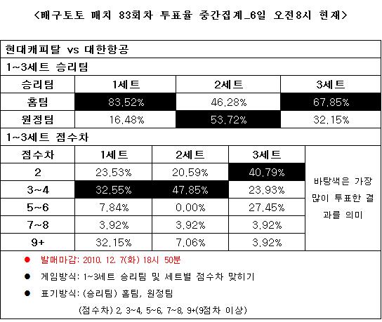 체육진흥투표권 수탁사업자인 오리온그룹의 스포츠토토 공식 온라인 발매사이트인 베트맨(www.betman.co.kr)은 오는 7일(화) 오후 7시에 천안 유관순체육관에서 치러지는 2010-11시즌 국내프로배구 현대캐피탈-대한항공전을 대상으로 한 배구토토 매치 83회차 게임 투표율 중간집계 결과 홈팀 현대캐피탈의 우세를 예상하는 것으로 나타났다.