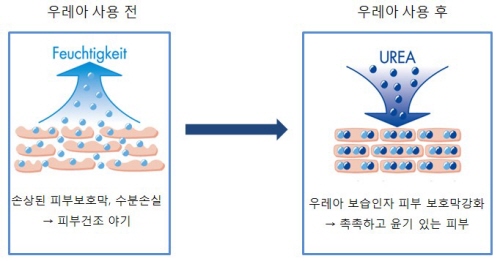 독일에서는 보습을 위해 '요소'를 많이 이용한다. '요소'는 독일어로 '우레아'라고 불리는 성분으로 각질을 부드럽게 만들어 주고 불필요한 '각질'만을 제거하는 기능을 가지고 있다. 사람 표피의 각질층에는 지질막(Lipids)이 있어 산성보호막 역할을 하는데, 수분이 밖으로 나가는 것을 막아주고 외부 물질이 침입하는 것을 막기 때문에 그 기능이 중요하다. 일반적으로 각질을 녹이는 성분들의 경우, 지질막까지 제거하는 것에 비해 '우레아'는 지질막은 남기고 그 위의 불필요한 각질만 제거해줘 뛰어난 보호막 기능과 동시에 보습을 유지할 수 있다. 또한 불필요한 각질과 노폐물을 제거해주기 때문에 다른 유용한 성분들이 피부에 잘 침투되도록 도와주는 역할을 한다.