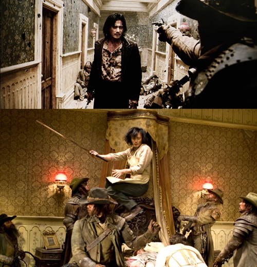 한번 휘두른 파워풀한 장동건의 칼날에 적의 목과, 팔이 잘려지는 건 순식간이다. 특히, 좁은 복도에서 총 든 수많은 적들과 오직 검 하나로 홀로 싸우는 장동건의 액션 장면은 영화 속 백미. 바람보다 빠른 장동건의 존재감만으로도 겁에 질린 적들은, 총 한번 제대로 쏘지 못하고 몰살당하고 만다. 이 장면은 김덕수 사물놀이의 다이나믹한 음악과 함께 연출되어, 강렬한 느낌은 배가 되었다.