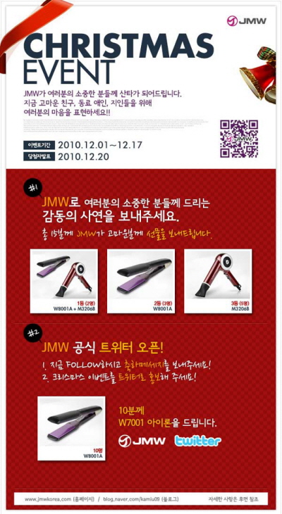 사랑하는 친구나 애인, 가족, 은사 등 크리스마스에 특별한 선물을 주고 싶은 지인들에게 (주)JMW의 헤어드라이어와 아이론을 대신 선물해주는 이벤트다.