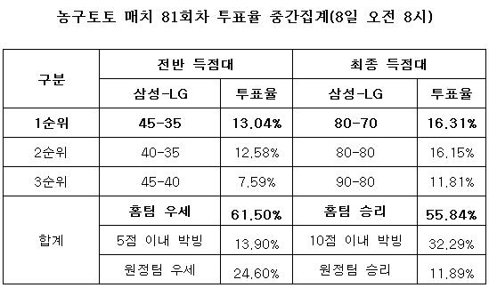 양 팀의 10점 이내 박빙승부를 예상한 참가자는 32.29%로 집계됐고, 나머지 11.89%는 원정팀 LG의 승리를 전망했다.